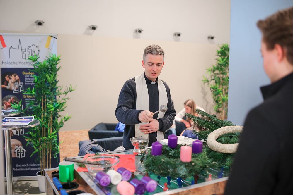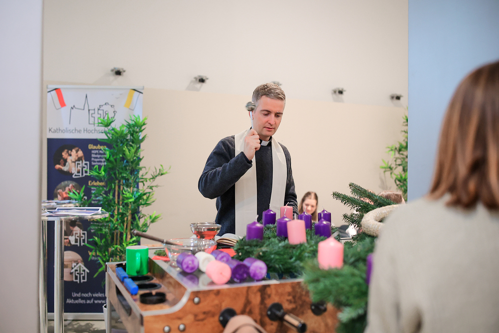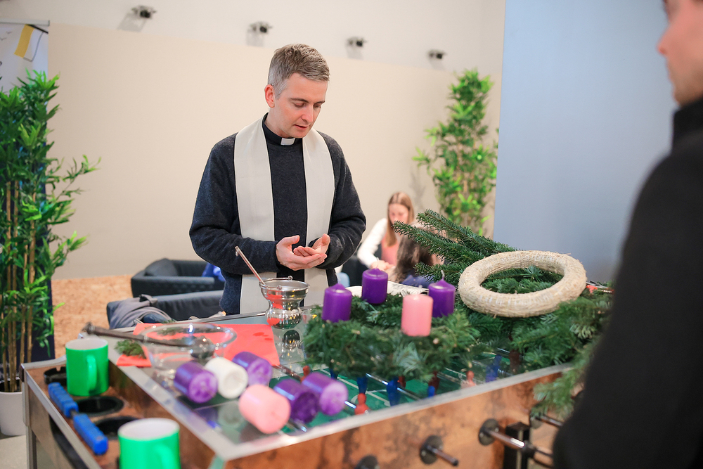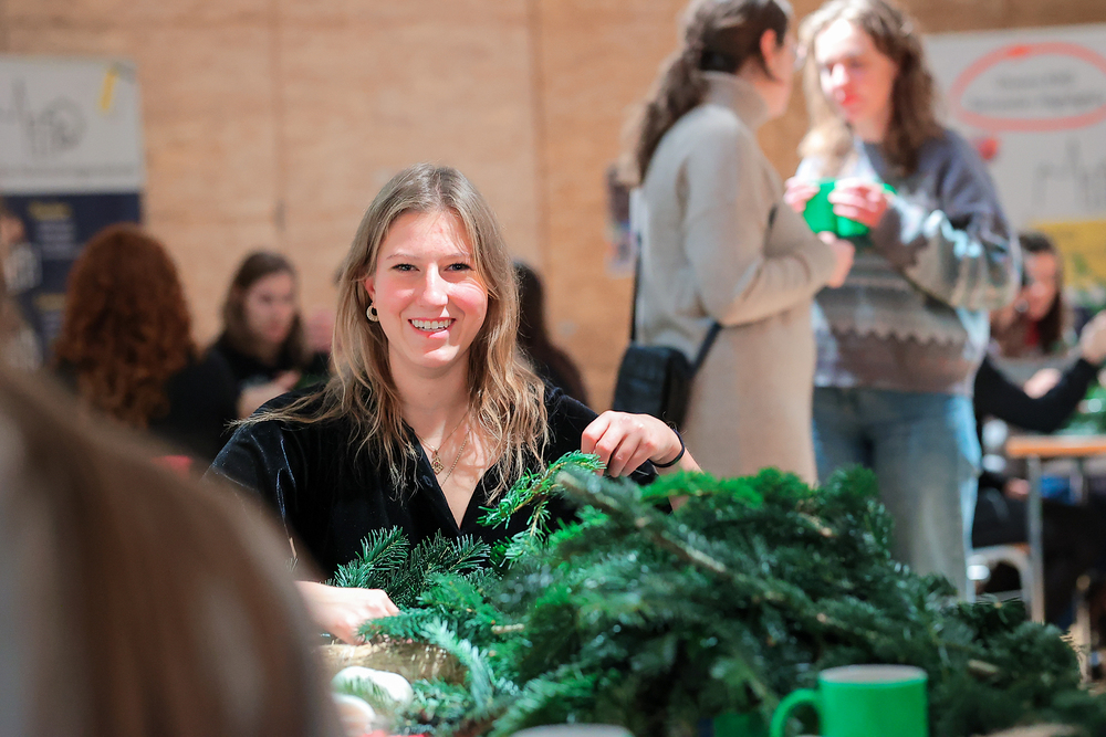 Gefüllt mit Tannenduft und über 160 Studierenden hat in sämtlichen Räumlichkeiten der Katholischen Hochschulgemeinde das beliebte KHG-Adventkranzbinden stattgefunden. Ob kirchenfern oder glaubensbegeistert: bunt durchmischt konnte man plaudern und sich bei Glühwein, Mandarinen und adventlicher Musik auf diese besondere Zeit der Erwartung einstimmen.